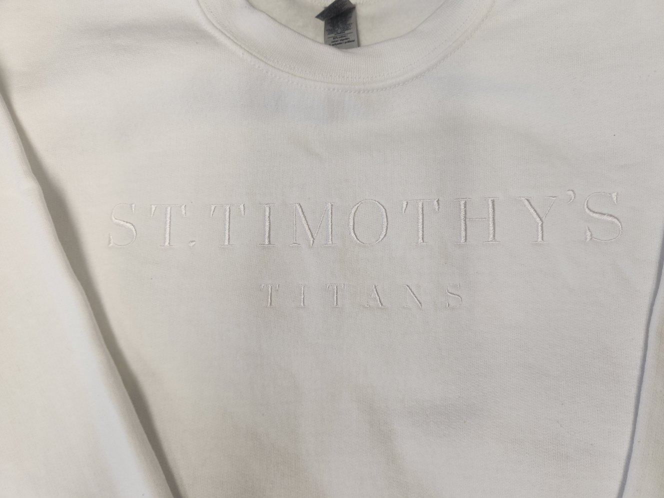 White Gildan crewneck sweatshirt with white embroidery "St. Timothy's Titans".
